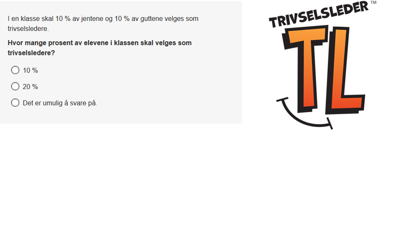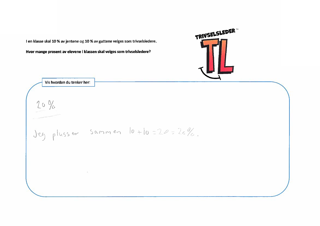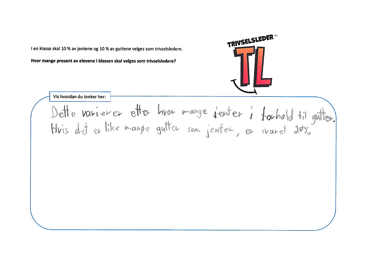 Oppgave 15 tester samme misoppfatning som oppgave 22, ved at 10 % av guttene og 10 % av jentene i en klasse skal velges som trivselsledere. Det som skiller oppgavene, er at i oppgave 22 får elevene vite at fotballomgangene er like lange, men de får ikke vite noe om det er like mange jenter som gutter i klassen. I tillegg får de som legger sammen prosenttallene, 20 %, noe som trolig oppleves som et mer sannsynlig svar enn 100 % i oppgave 22. Andelen elever som svarer 20 %, er 87 % på 6. trinn og 69 % på 9. trinn, og nesten 90 % av elevene som svarer 100 % i oppgave 22, svarer 20 % i oppgave 15. Det gjelder både 6. og 9. trinn.