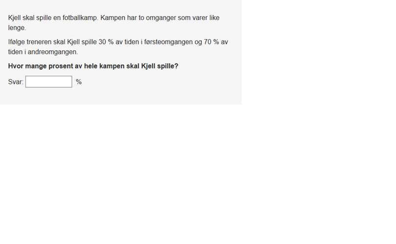 I oppgave 22 skal elevene finne ut hvor stor del av en hel fotballkamp Kjell skal spille, når han skal spille 30 % av tiden i førsteomgang og 70 % av tiden i andreomgang. Elever som ikke tar hensyn til helheten, legger sammen de to prosenttallene, 30 % og 70 %, og svarer 100 %.