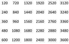 Siden tabellen er en multiplikasjonstabell for 120, finner vi for eksempel 13 · 120 = 1560 i tredje rute i tredje kolonne. I de to første kolonnene har vi multiplisert 120 med tallene 1-10.